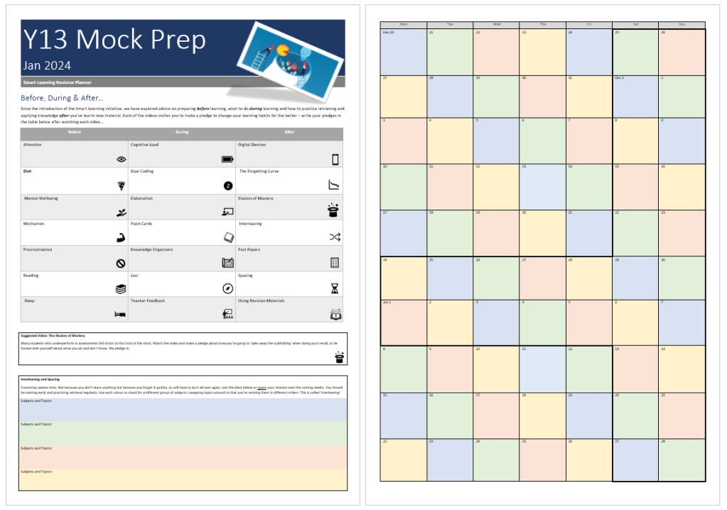 Below is an example of a poster helping students prepare for mock exams in January 2024. The left page starts by linking to the Smart Learning videos but at the bottom, there is an instruction to group topics into colours and then interleave them through the revision calendar.